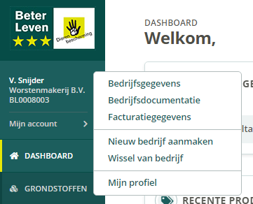 Uw actieve bedrijf wordt in de groene menubalk direct onder uw naam weergegeven.